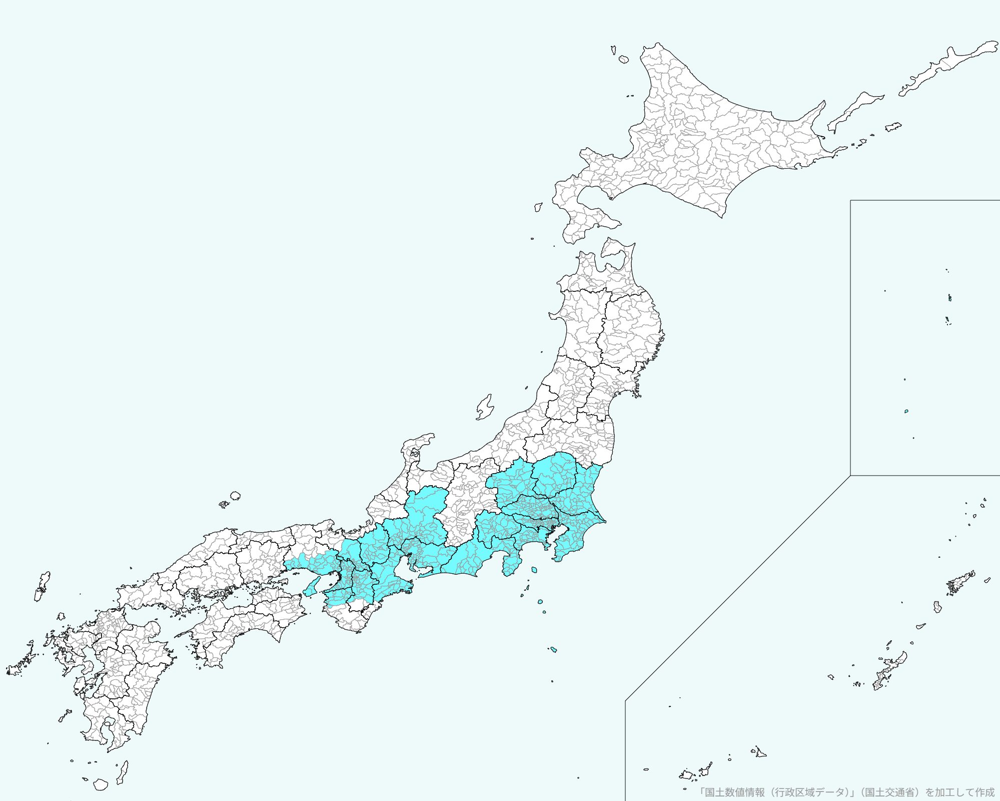 一、八五九・九MHzを超え一、八七九・九MHz以下の帯域の周波数(以下「一・七GHz帯東名阪バンド」という。)にあっては、茨城県、栃木県、群馬県、埼玉県、千葉県、東京都、神奈川県、山梨県、岐阜県、静岡県、愛知県、三重県(尾鷲市、熊野市及び南牟婁郡を除く。)、滋賀県、京都府(福知山市、舞鶴市、綾部市、宮津市、京丹後市、北桑田郡、船井郡、天田郡、加佐郡及び与謝郡を除く。)、大阪府、兵庫県(豊岡市、養父市、朝来市、宍粟市、丹波市、篠山市、西脇市、多可郡、神崎郡、飾磨郡夢前町、宍粟郡、揖保郡新宮町、佐用郡、赤穂郡及び美方郡を除く。)、奈良県(吉野郡十津川村及び下北山村を除く。)及び和歌山県(御坊市、田辺市、新宮市、日高郡、西牟婁郡及び東牟婁郡を除く。)の区域(行政区画に変更があった場合においても、当該区域は、なお従前の区域による。)。